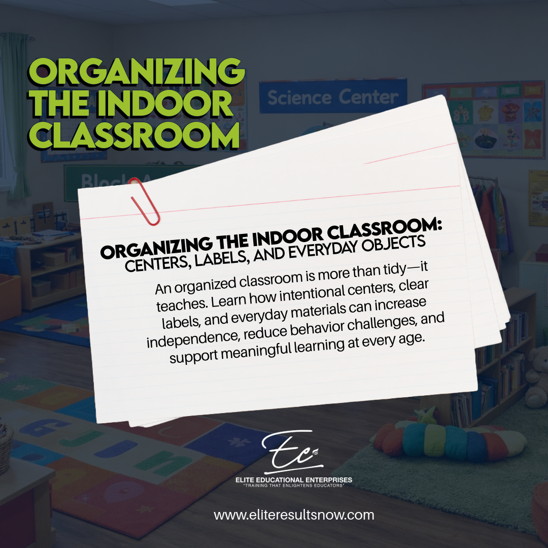 Description: An organized classroom is more than tidy—it is a powerful teaching tool. This training helps early childhood educators design intentional indoor learning environments using classroom centers, clear labeling, and everyday objects to support independence, engagement, and developmentally appropriate learning.