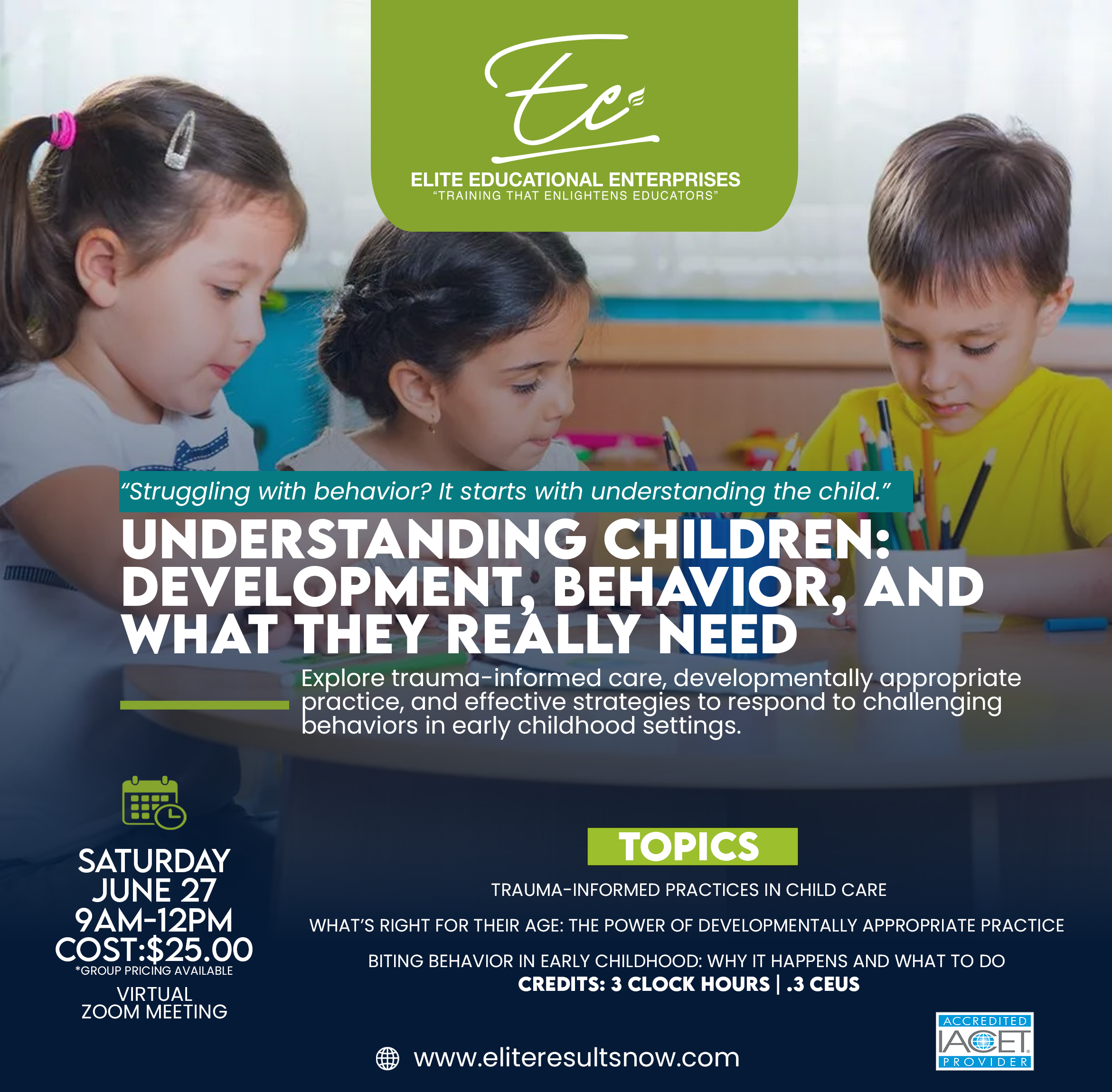 Understanding children’s behavior starts with understanding the child. In early childhood settings, educators are often faced with challenging behaviors, emotional outbursts, and uncertainty about what is developmentally appropriate. This training equips participants with the knowledge and practical strategies needed to interpret behavior through a developmental and trauma-informed lens.